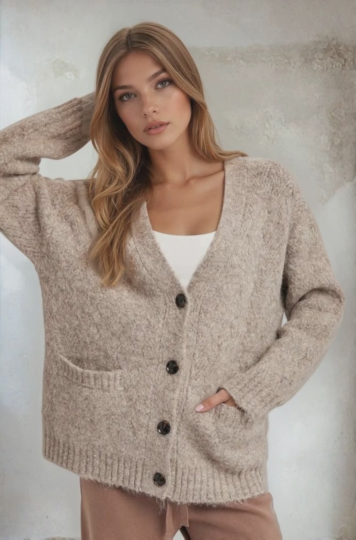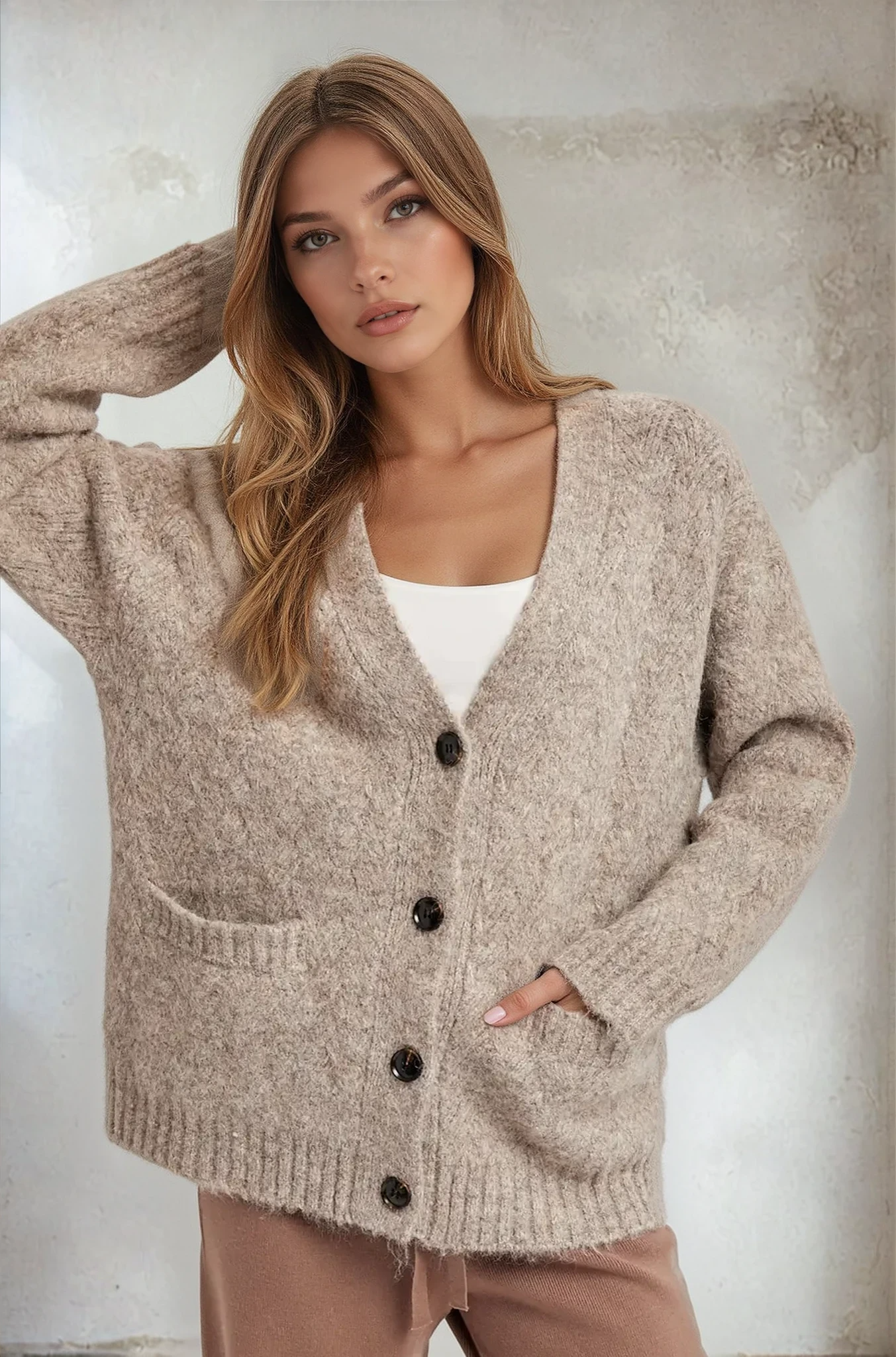 Layer up with effortless style in this button-down knit cardigan—your new go-to for cozy-chic vibes. Crafted from soft, breathable knit fabric, it's perfect for throwing over your favorite tee or dress. The classic button-front design keeps things polished while the relaxed fit ensures all-day comfort. Whether you're running errands or heading out for the evening, this versatile piece transitions seamlessly from season to season. A wardrobe essential that's anything but boring.