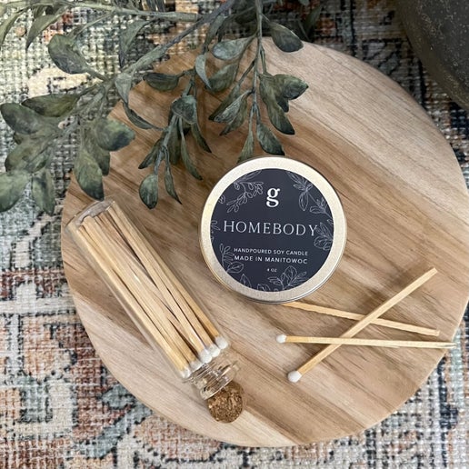 Hand poured with 100% Soy Wax in our Manitowoc, Wisconsin shop. Choose from a 4oz mini candle in gold tin, a one wick 9oz candle in a glass tumbler or the larger 3-wick 20 oz candle in a glass vessel.