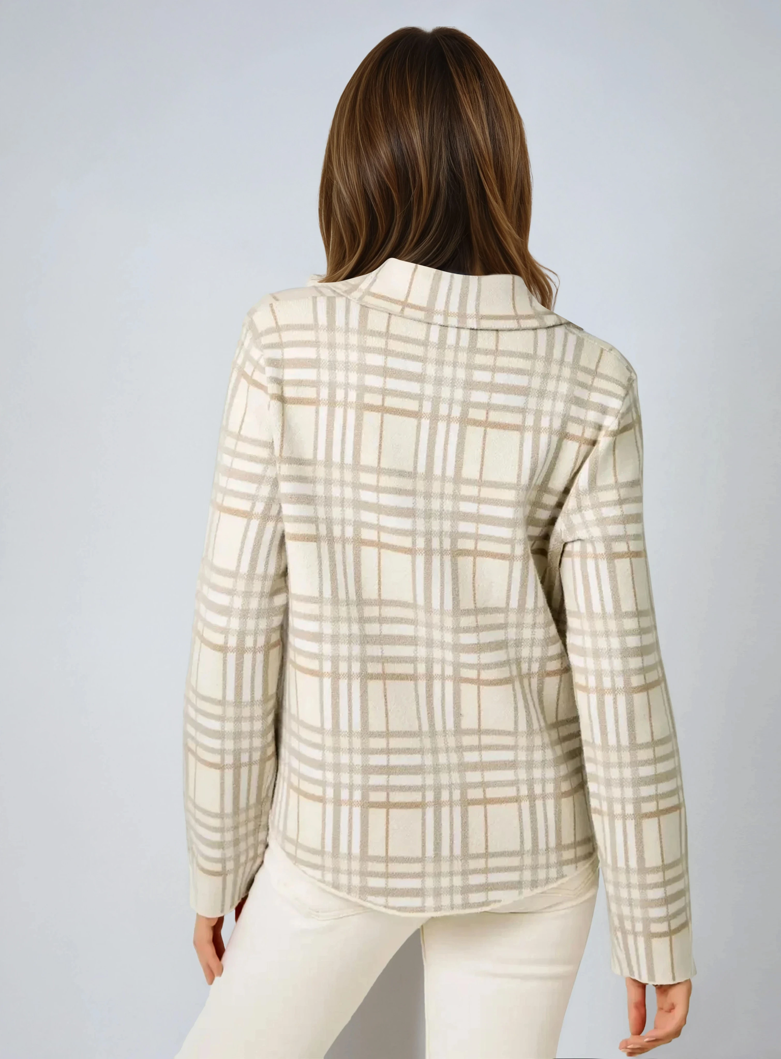 Stay stylish and warm in our Check Patterned Sweater Jacket. Perfect for layering, this jacket features a button front closure, a collar, and two chest pockets for added convenience. It's the perfect addition to any outfit for a cool and casual look.