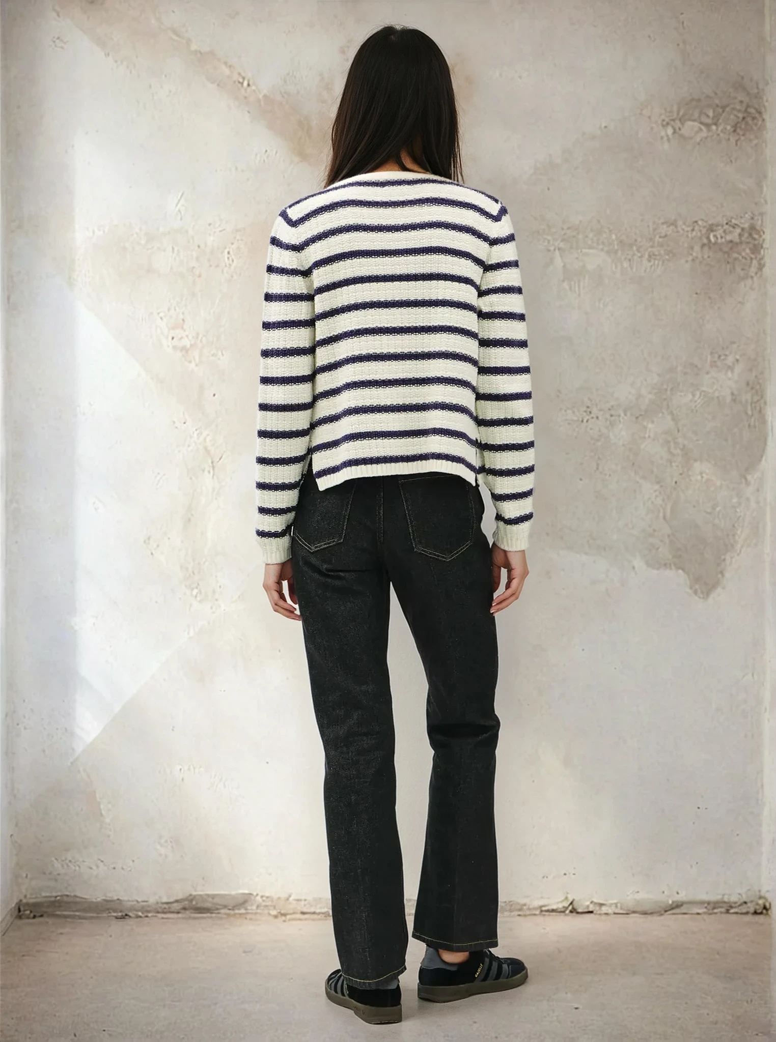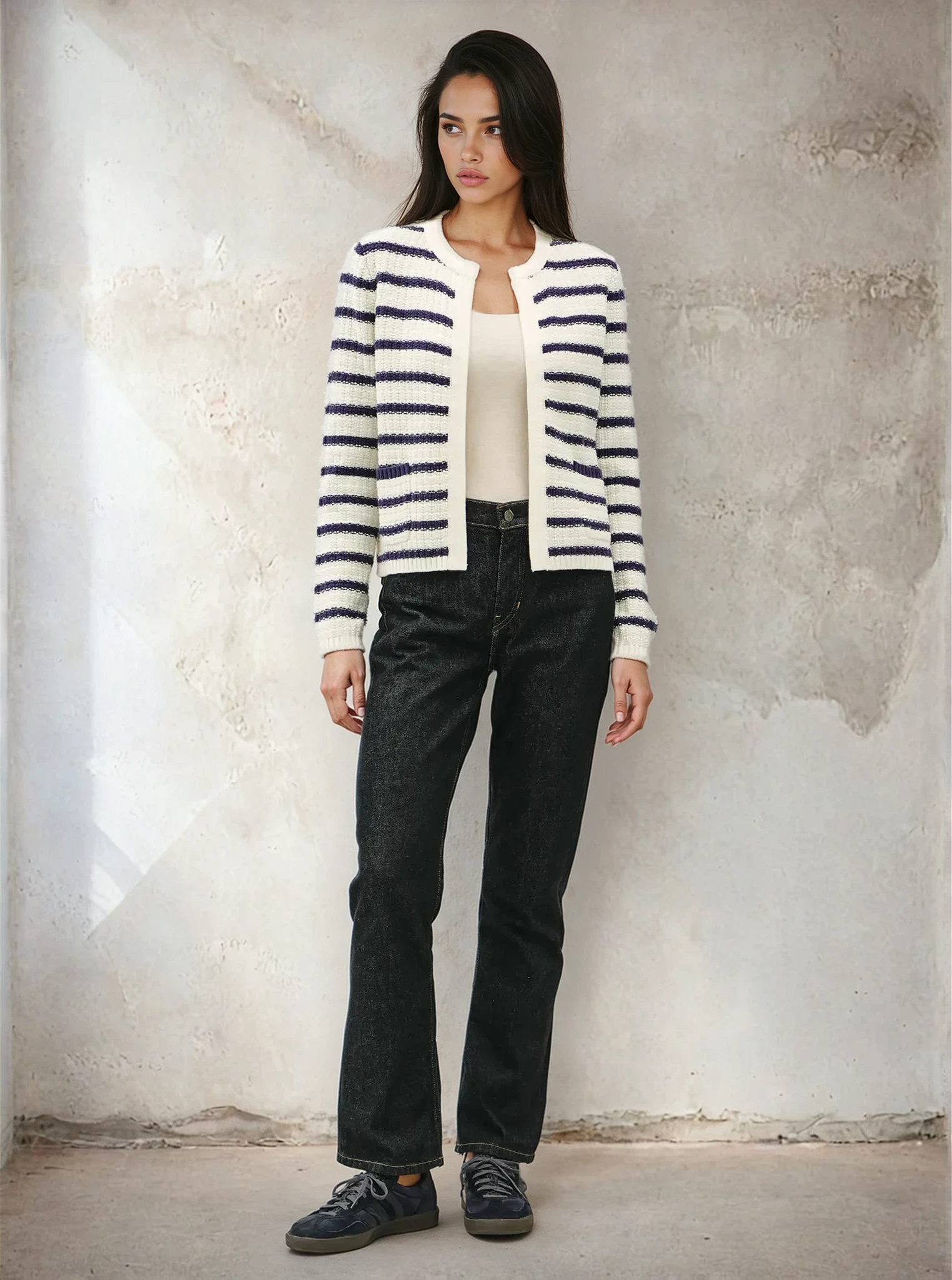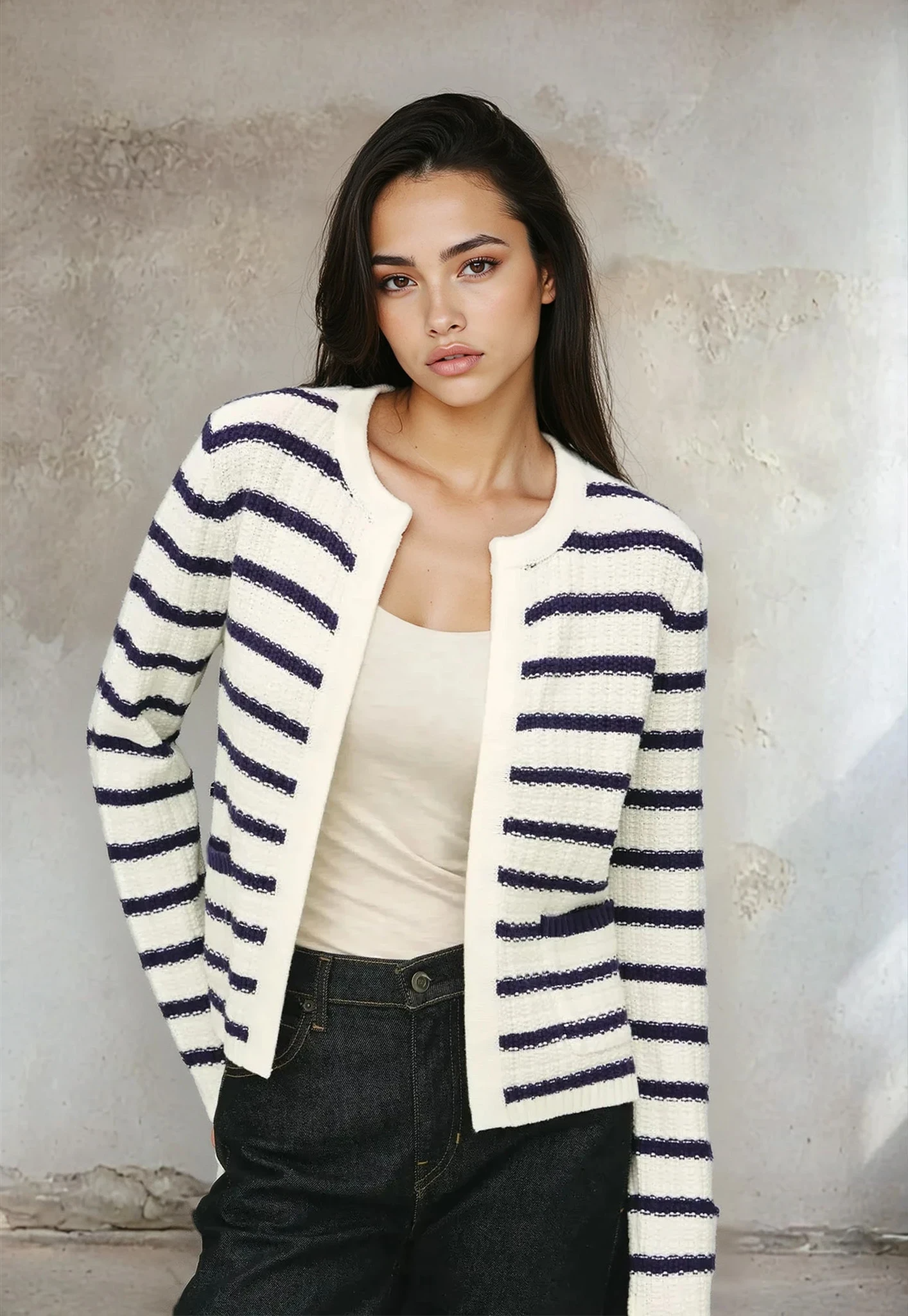 Layer up with effortless style in this chunky knit striped cardigan. The relaxed open front and cozy oversized fit make it perfect for throwing on over your favorite tee or dress. Bold stripes add visual interest while the substantial knit keeps you warm without the bulk. Whether you're heading to brunch or settling in for a casual day, this cardigan strikes the perfect balance between comfort and chic.