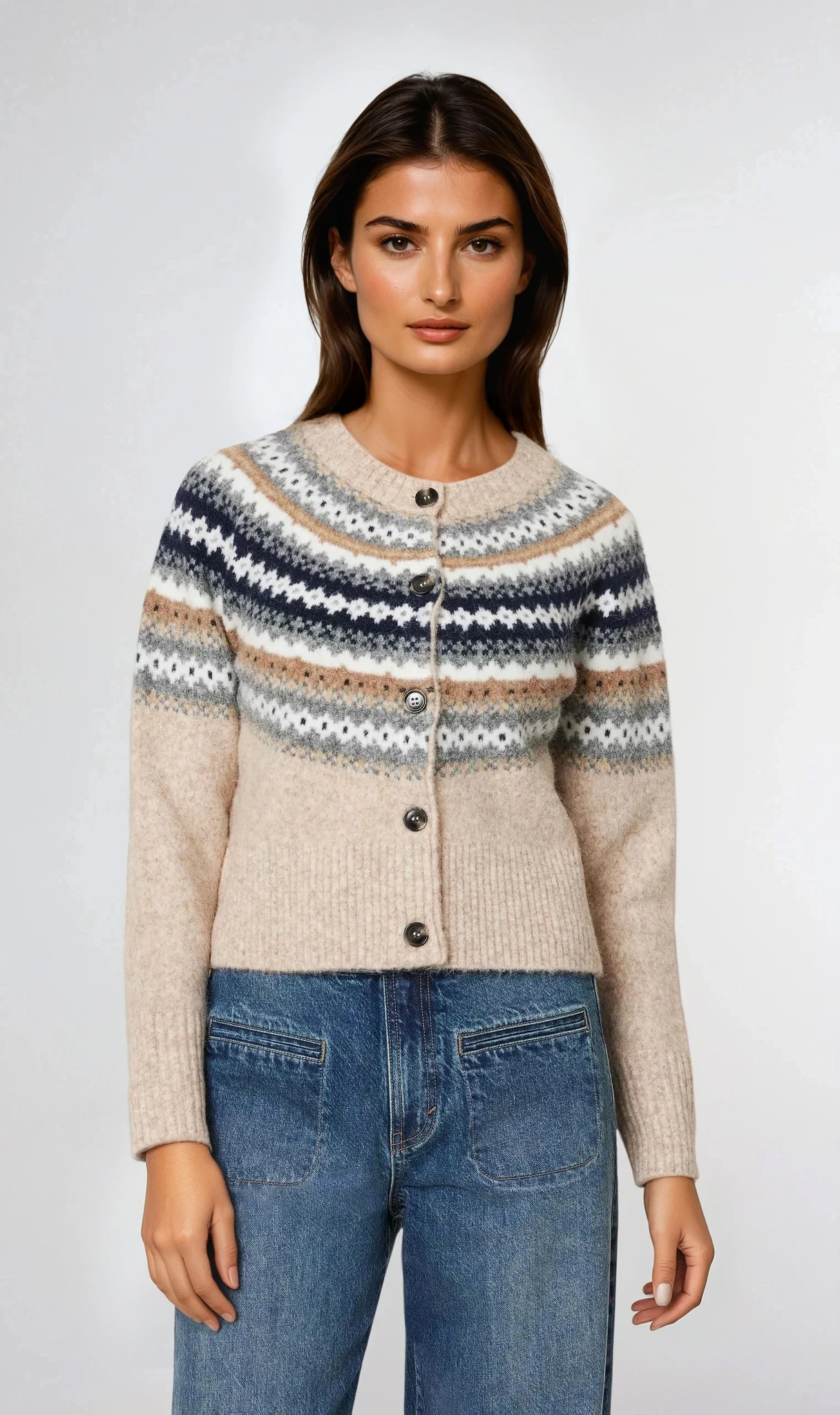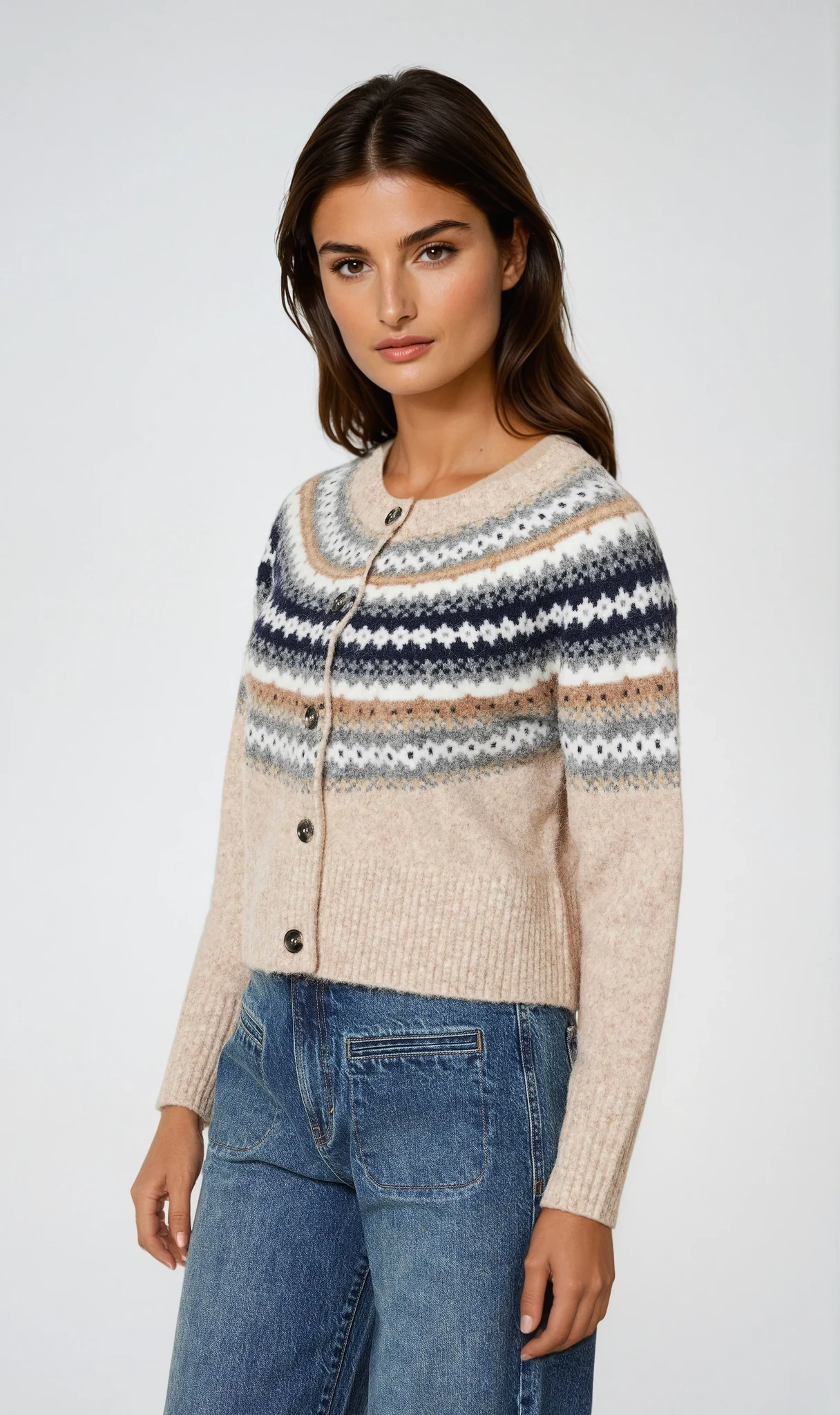 Wrap yourself in cozy charm with this Fair Isle cardigan—a timeless piece that brings festive flair to any outfit. Featuring classic geometric patterns in rich, complementary hues, this cardigan layers beautifully over everything from casual tees to dresses. The soft, comfortable knit keeps you warm without the bulk, while the button-front design makes it easy to adjust your coverage throughout the day. Perfect for crisp autumn evenings or holiday gatherings, this versatile staple deserves a permanent spot in your wardrobe.