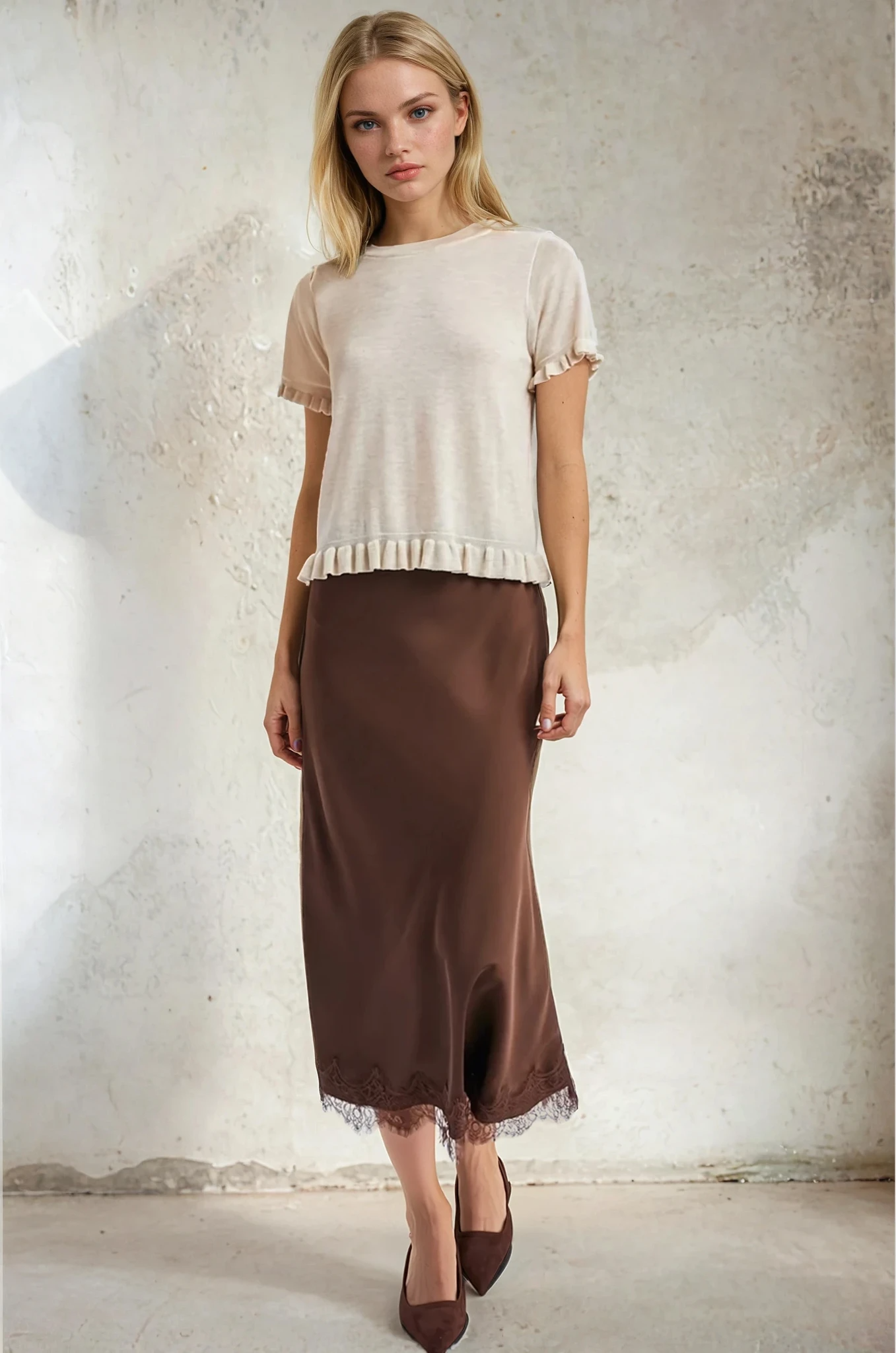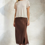 Satin Lace Trimmed Midi Skirt Brown