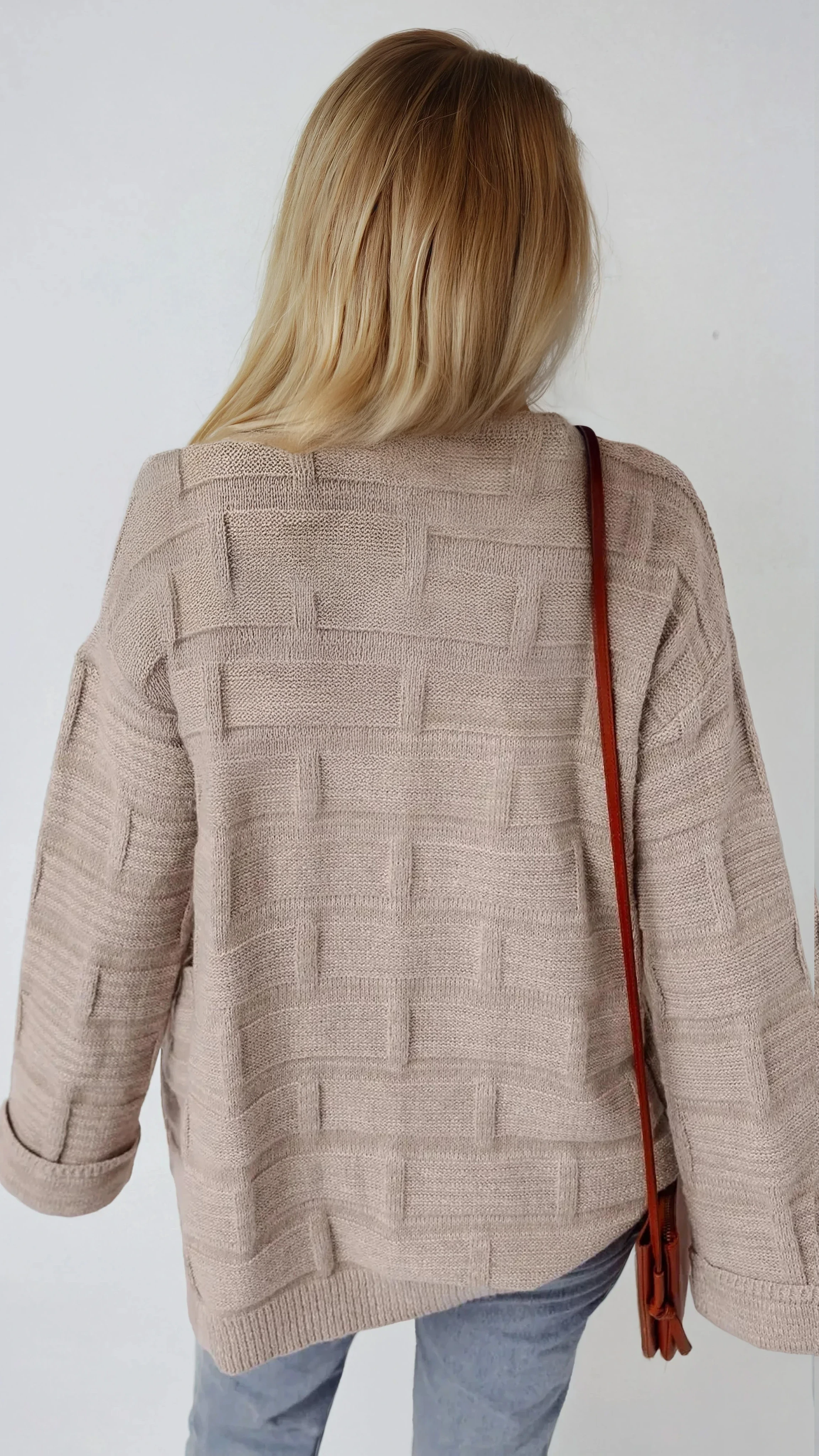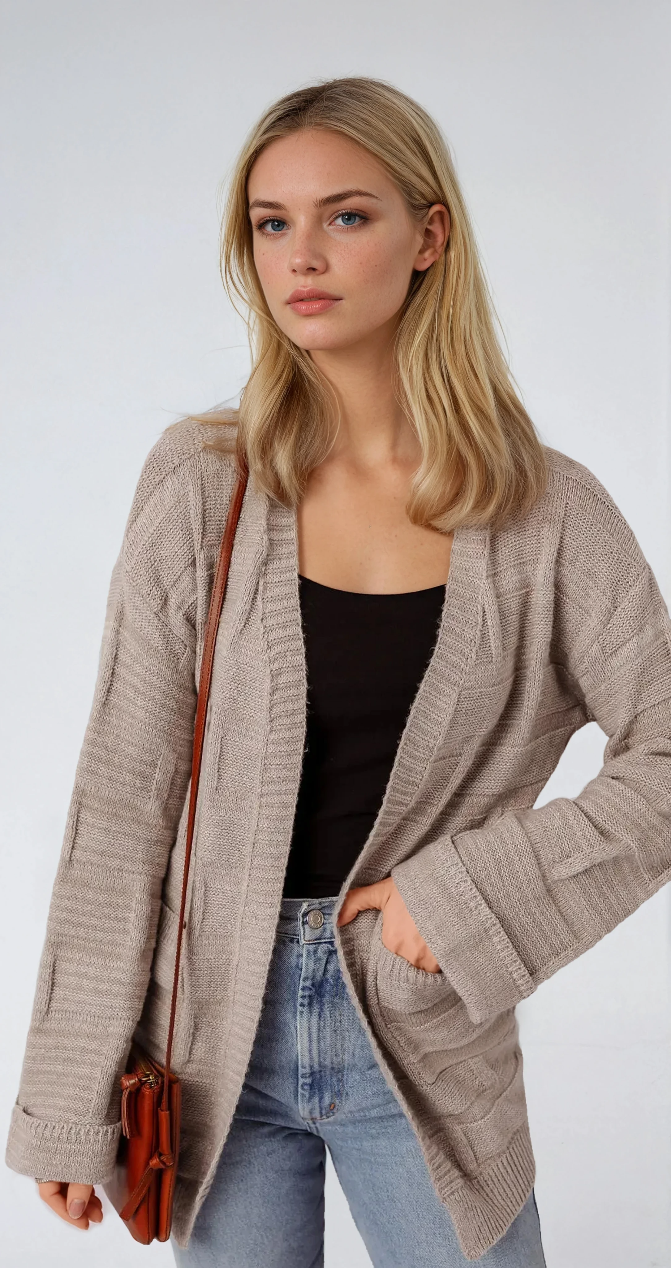 Wrap yourself in cozy charm with this Textured Knit Cardigan. Its playful knit pattern adds a fun twist to your everyday look while keeping you warm and comfy. Perfect for layering on chilly days or adding a fashionable touch to casual outfits. Embrace effortless style with a cardigan that’s as lively as you are.