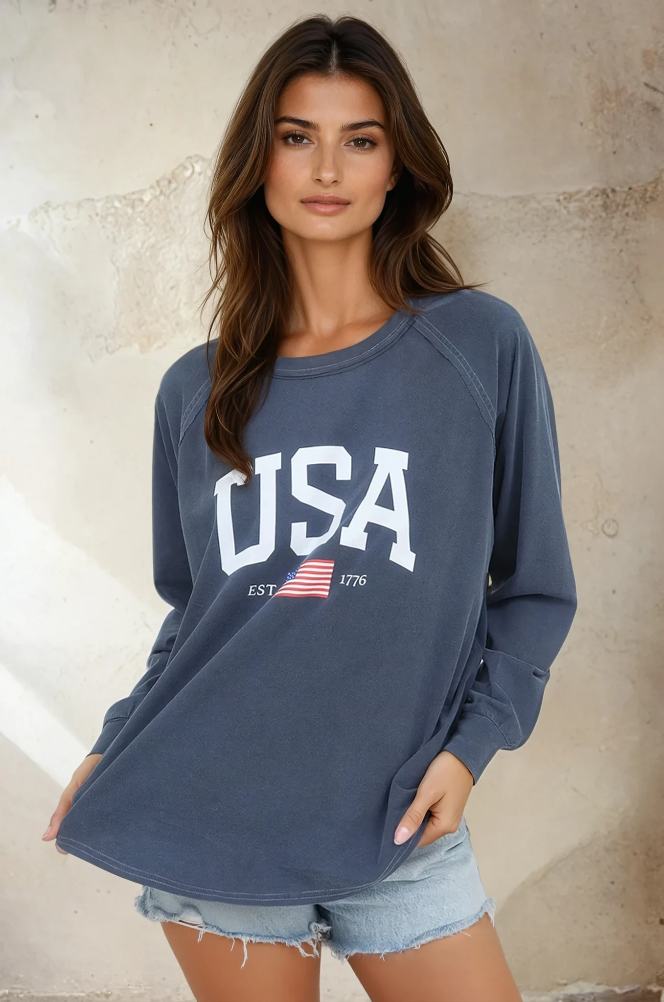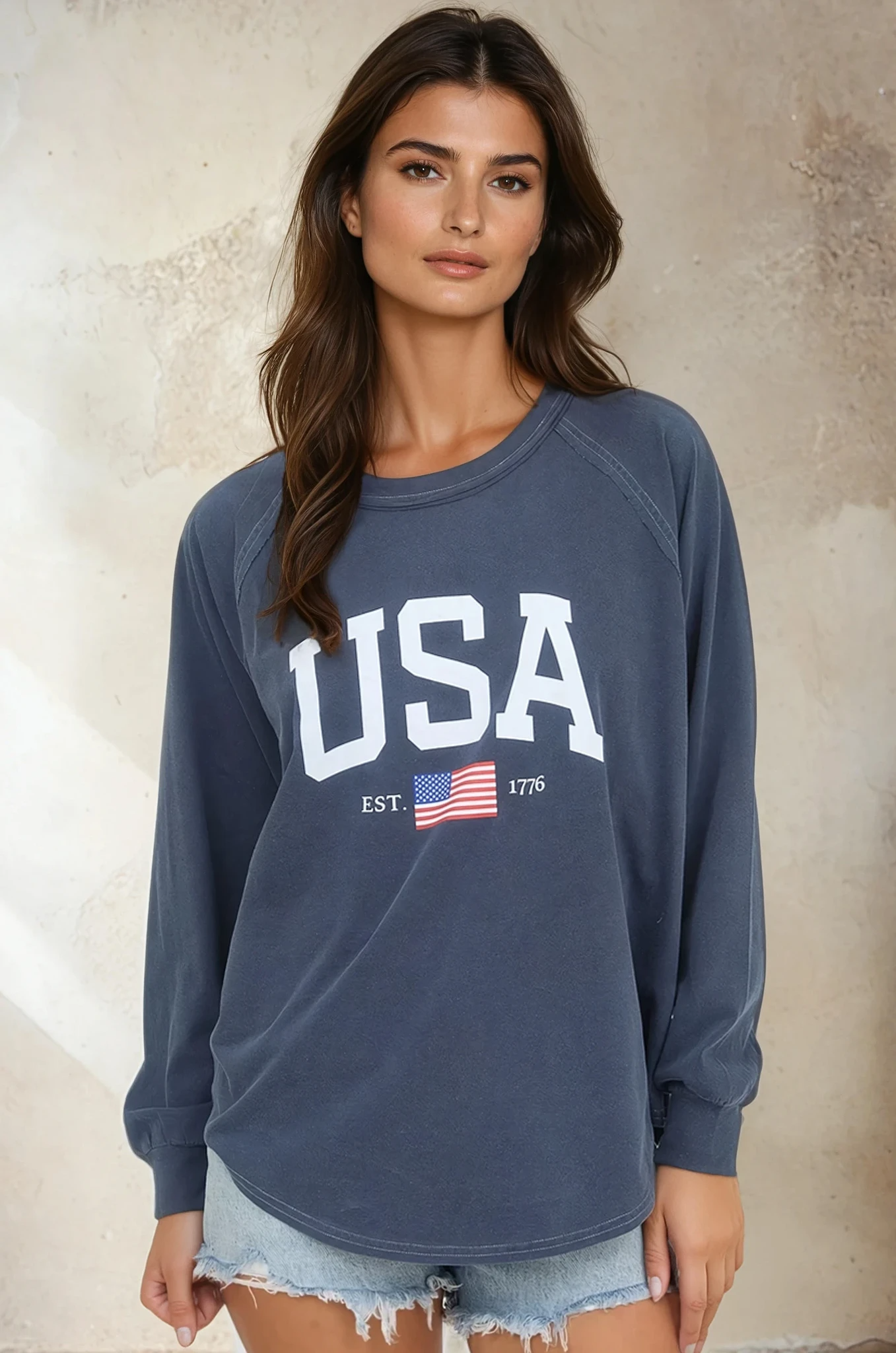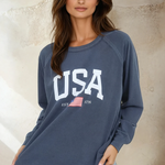 Celebrate your patriotic spirit with this navy knit top featuring a bold USA graphic. Crafted from soft, breathable knit fabric, it's the perfect go-to piece for casual outings, weekend adventures, or showing your pride any day of the week. Comfortable, stylish, and unapologetically American—this top is ready for whatever comes your way.
