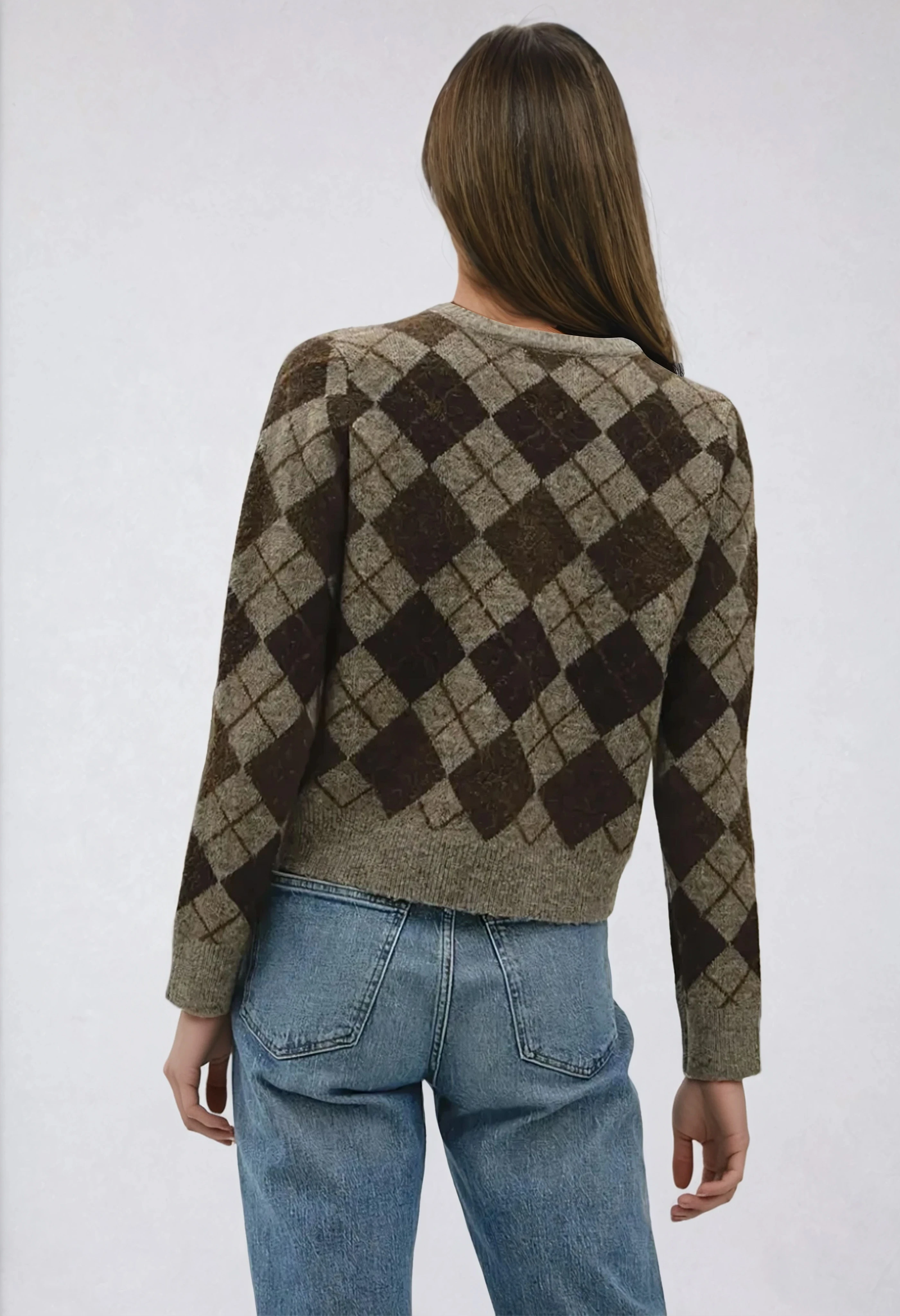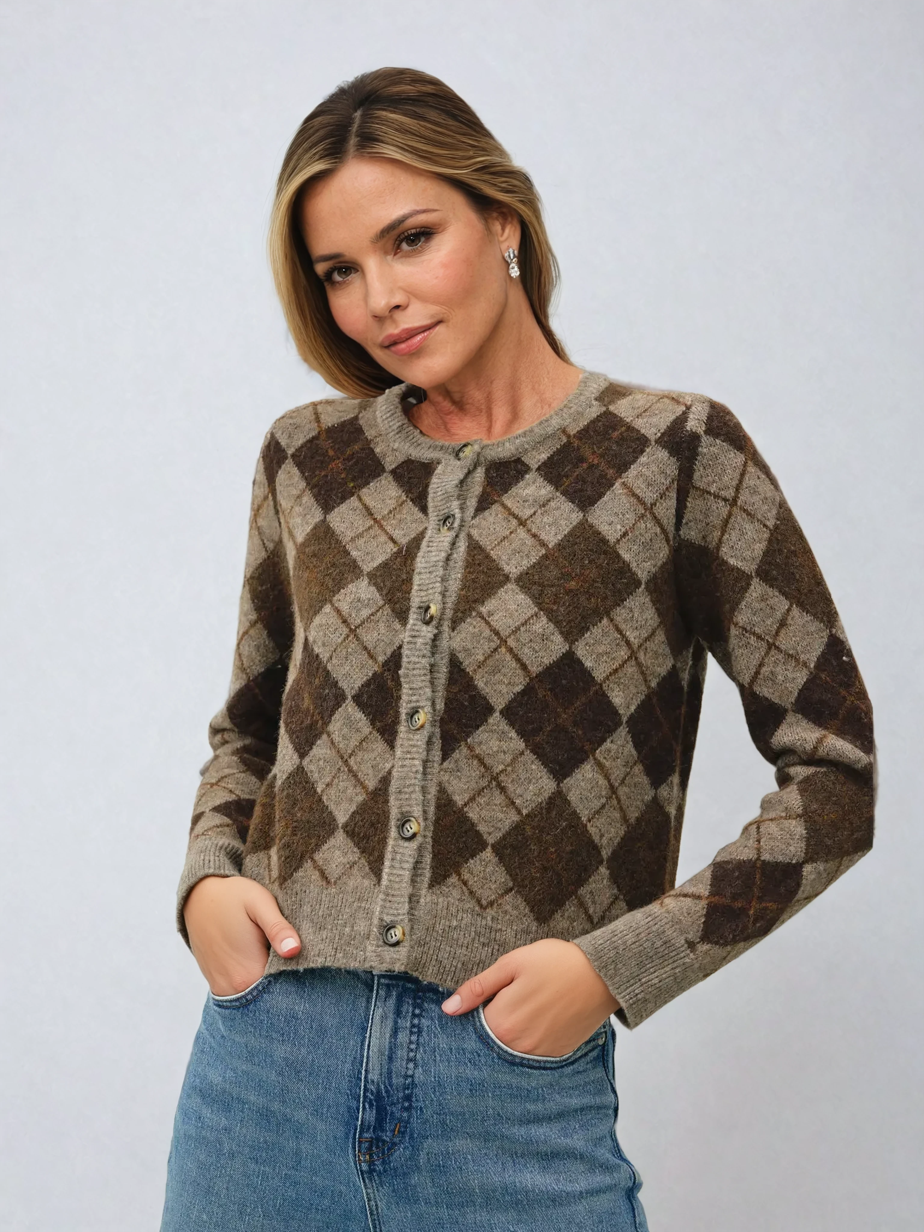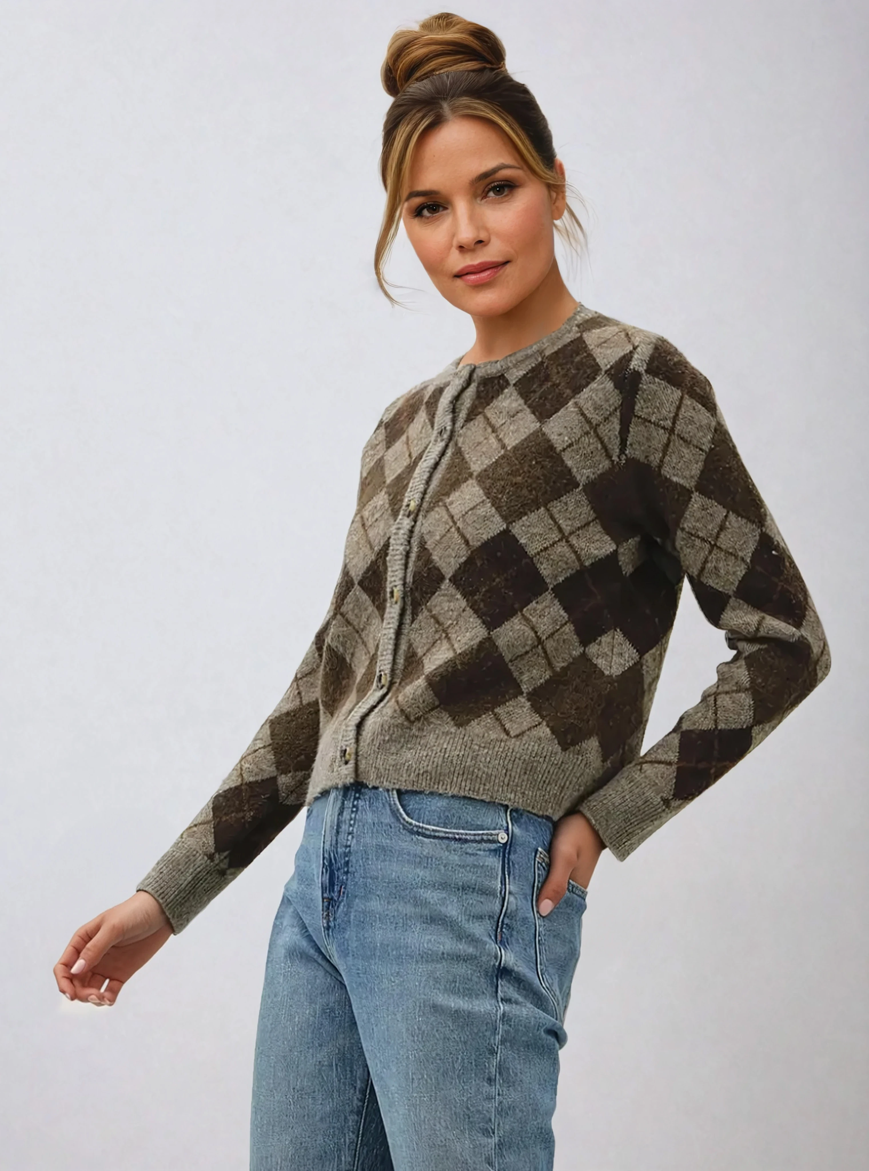 Wrap yourself in cozy charm with this Wool Blend Argyle Cardigan. Its classic diamond pattern adds a fun twist to your outfit, while the soft wool blend keeps you warm without overheating. Perfect for layering on chilly days or brightening up a casual look with a dash of vintage flair. Stay snug and stylish wherever you go!